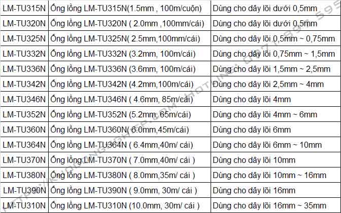 Bảng tra kích thước ống lồng tương ứng với dây điện