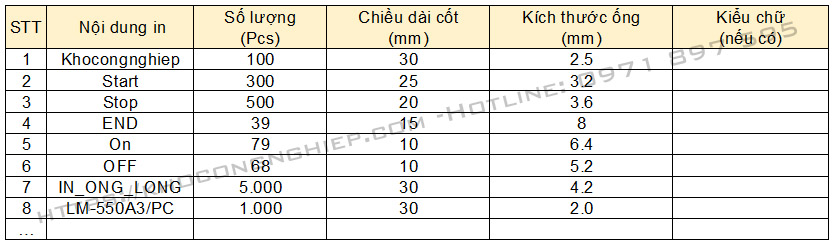 Bước 2 - Gửi dữ liệu: Khách hàng gửi file Excel chứa danh sách các ký hiệu cần in (bao gồm: nội dung in, số lượng mỗi loại, chiều dài đoạn cắt).