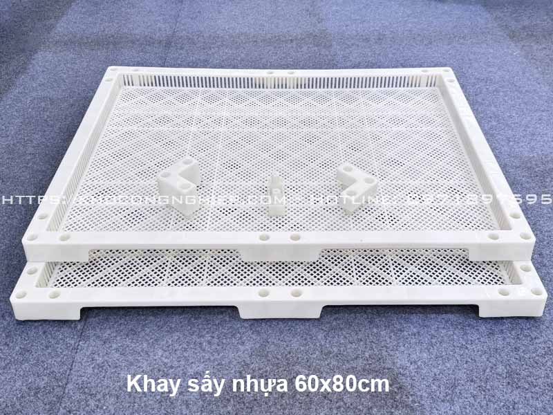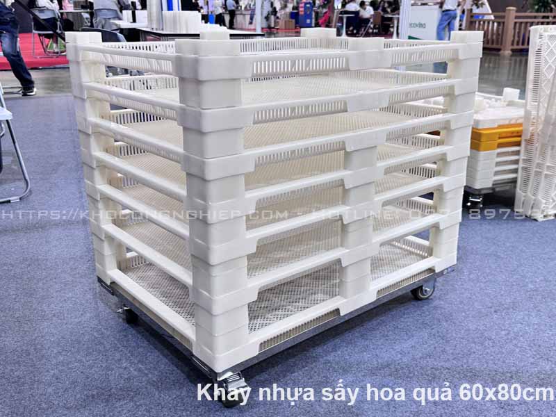 - Khay nhựa sấy hoa quả 60x80cm: Đây là kích thước tiêu chuẩn đã được nghiên cứu kỹ lưỡng để tối ưu hóa luồng khí đồng đều bên trong buồng sấy. Khay nhựa PP đạt chuẩn an toàn vệ sinh thực phẩm (HACCP/ISO) đảm bảo không có phản ứng hóa học với nguyên liệu dưới nhiệt độ sấy, giúp nâng cao năng suất và tính nhất quán của sản phẩm.
