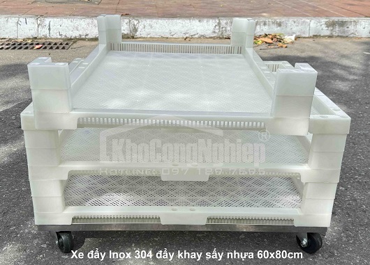 Tại xưởng, khay sấy nhựa chuẩn 60x80cm (vật liệu: nhựa PP chịu nhiệt 120°C, nhẹ, dễ thao tác, dễ vệ sinh, giá tốt) được sử dụng phổ biến nhất do dễ dàng lắp ghép với các dòng tủ sấy tiêu chuẩn, xe Inox304 đẩy khay sấy có thể đẩy 20–25 tầng, và phù hợp với dây chuyền sản xuất vừa đến lớn.