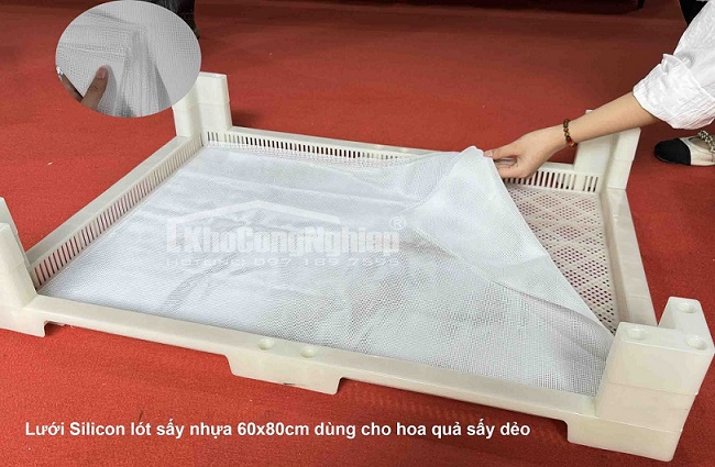 Ngoài ra, chúng tôi hỗ trợ gia công khay riêng lẻ theo đặc thù từng xưởng, kết hợp cung cấp tấm lót lưới silicon chịu nhiệt giúp chống dính hoàn toàn và tái sử dụng bền bỉ đến 500 lần sấy.