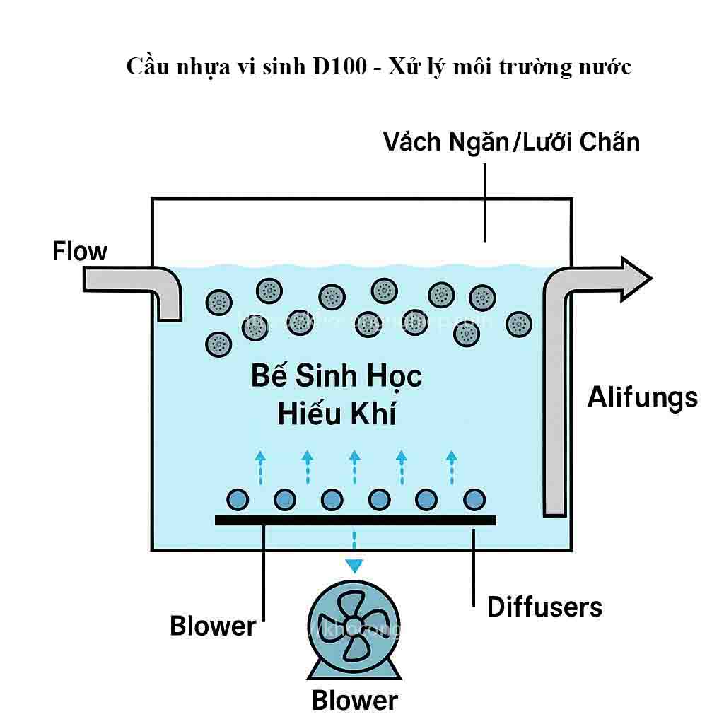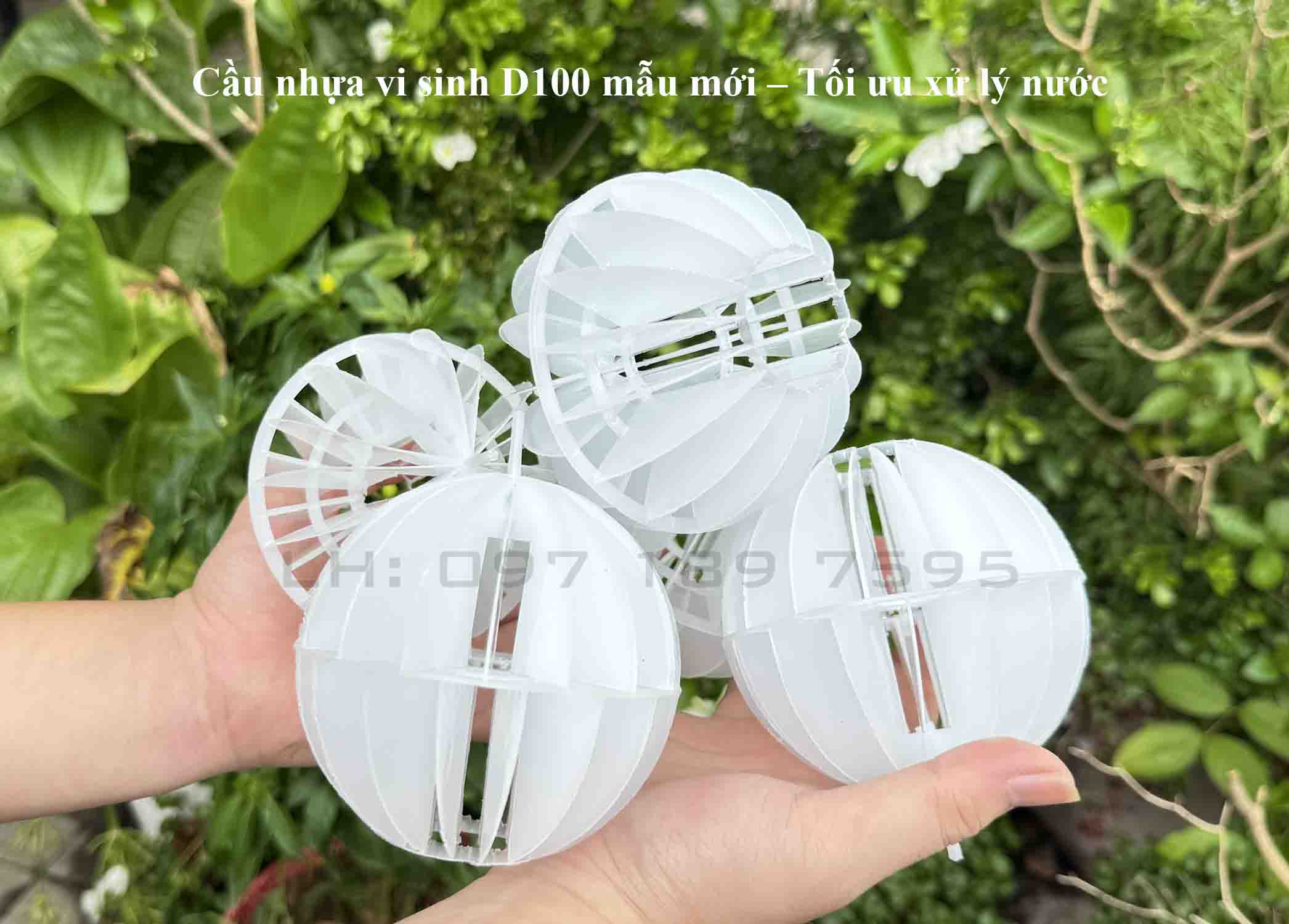 Cầu nhựa D100 được chế tạo từ nhựa PP hoặc HDPE nguyên sinh, có khả năng chống tia UV, chịu ăn mòn hóa chất và hoạt động ổn định trong dải nhiệt độ 5–80°C. Với kích thước tiêu chuẩn khoảng 100 mm, diện tích bề mặt đạt 250–300 m²/m³ và độ rỗng ≥ 90–92%, sản phẩm cho phép vi sinh vật bám dính tốt, tạo điều kiện tối ưu cho quá trình phân hủy chất hữu cơ, xử lý BOD, COD và Amoni trong nước thải. Thiết kế dạng cầu rỗng nhiều khe giúp dòng nước lưu thông đồng đều, hạn chế tắc nghẽn và tạo điều kiện cho vi sinh phát triển cả lớp hiếu khí lẫn thiếu khí.