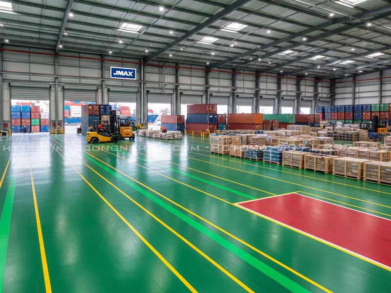 Yêu cầu: Chịu mài mòn cực cao từ xe nâng, container; chống bụi, chống trơn. Hệ Epoxy trát cát kết hợp với sơn kẻ vạch JMAX để đánh số kệ, vẽ ô chứa hàng, phân luồng giao thông nội bộ một cách khoa học là giải pháp bắt buộc.