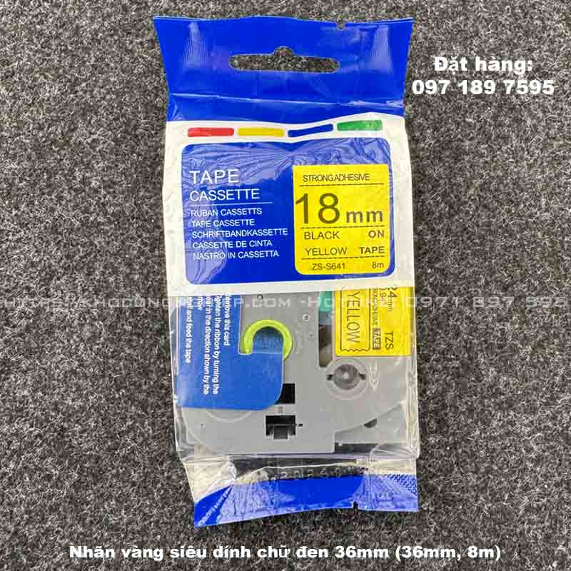 Nhãn in siêu dính TZS-S641 Chữ đen, nền vàng, dài 8m, khổ rộng 18mm. Nhãn chịu lực ma sát, ánh nắng, hoá chất thông thường, chịu được thời tiết khắc nhiệt -80°C đến +150 °C. Khả năng chống thấm nước, bám dính cao. Nhãn sử dụng cho các loại máy Brother P-Touch